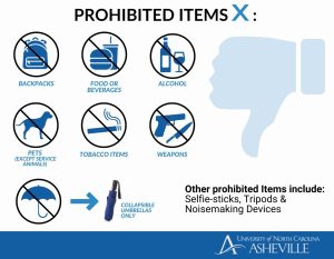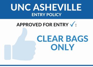 UNC Asheville has a Clear Bag Policy. We are not able to store personal items on site and guests should make arrangements to secure items prior to arriving on campus.  Exceptions to the Clear Bag Policy are subject to search and include the following: